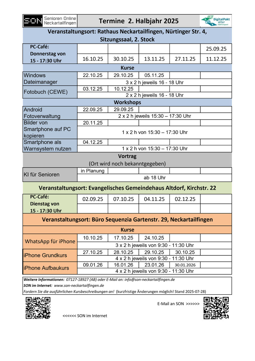 Als einer von 150 Erfahrungsorten sind wir, Senioren Online Neckartailfingen (SON), seit April 2022 offiziell Teil der bundesweiten Initiative DigitalPakt Alter. Mit unseren Angeboten unterstützen wir ältere Menschen dabei, sich im digitalisierten Alltag zurechtzufinden. Konkret können ältere Menschen bei uns hier vor Ort Einstiegskurse für den Umgang mit Laptop, Android und iOS (Apple) Smartphones und das 14-tägige PC-Café für jeden besuchen.